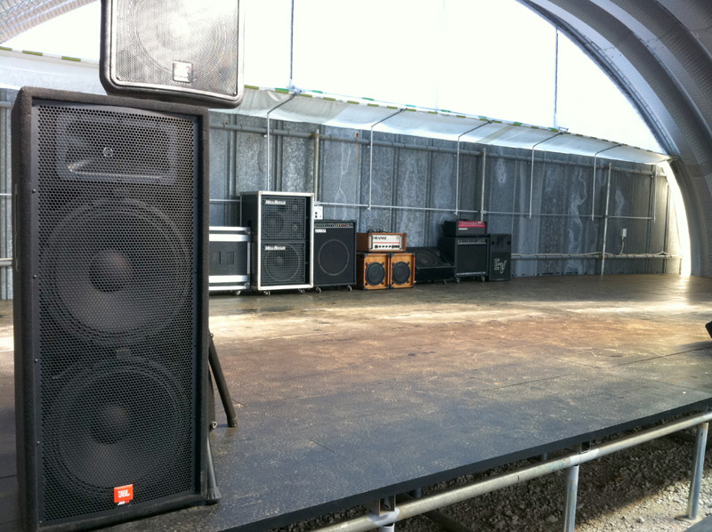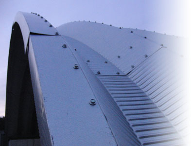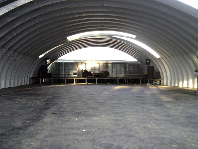 ガルバニウム鋼板によるジョイントドーム 誰でも簡単に、数人で組み立てることが可能。 大きなものから、小さなガレージまで長さは無限大。 こちらのアーチガレージは40ft幅の60ft長となります。 約12mの20mの全天候室内空間となります。 奥はライブステージ、音響設備完備